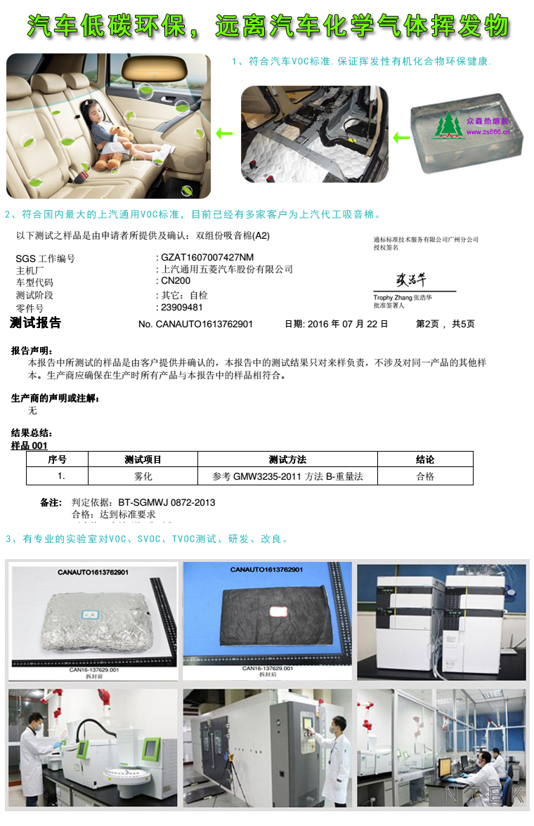 随着热熔胶的不断成熟现在吸音棉复合大多采用热熔胶进行粘合,众森热熔胶经过不断攻克技术难关,在汽车应用领域取得了明显优势,众森汽车热熔胶已经符号VOC,SVOC,TVOC标准气味等级高,无醛酮,低雾化,通过柳州五菱汽车标准、上海通用标准、吉利汽车、长安汽车、绅龙汽车标准。